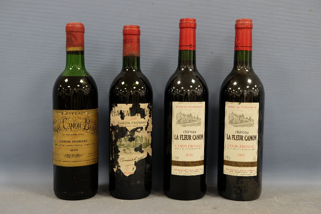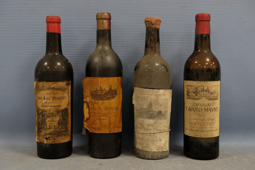 Château Figeac, Saint-Emilion, premier cru 1924 (1 bouteille), Château Ausone, Saint-Emilion 1951 (1 bouteille), Château Canon, Saint-Emilion premier grand cru 1950 (1 bouteille) et Château Grand-Mayne, Saint-Emilion grand cru classé 1964 (1 bouteille) (niveaux bas) | 200 - 300 € | Sélectionner |