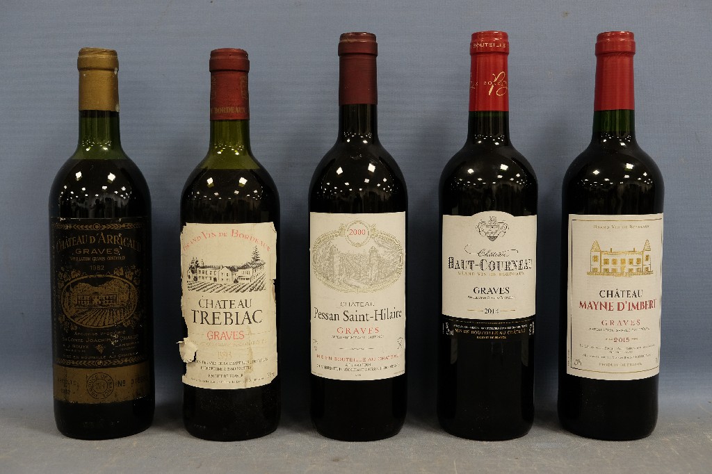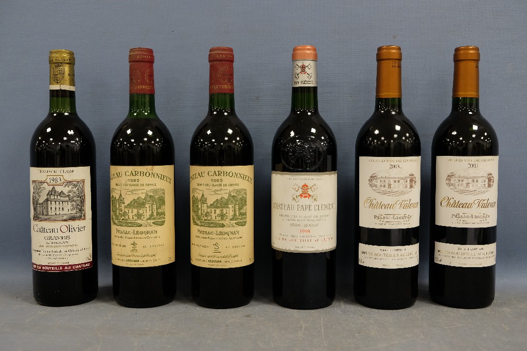 PESSAC-LEOGNAN, grand cru classé : Château Olivier 1983 (1 bouteille), Château Carbonnieux 1989 (2 bouteilles), Château Pape Clément 1998 (1 bouteille) et Pessac-Leognan, Château Valoux 2003 (2 bouteilles) | 150 - 200 € | Sélectionner |