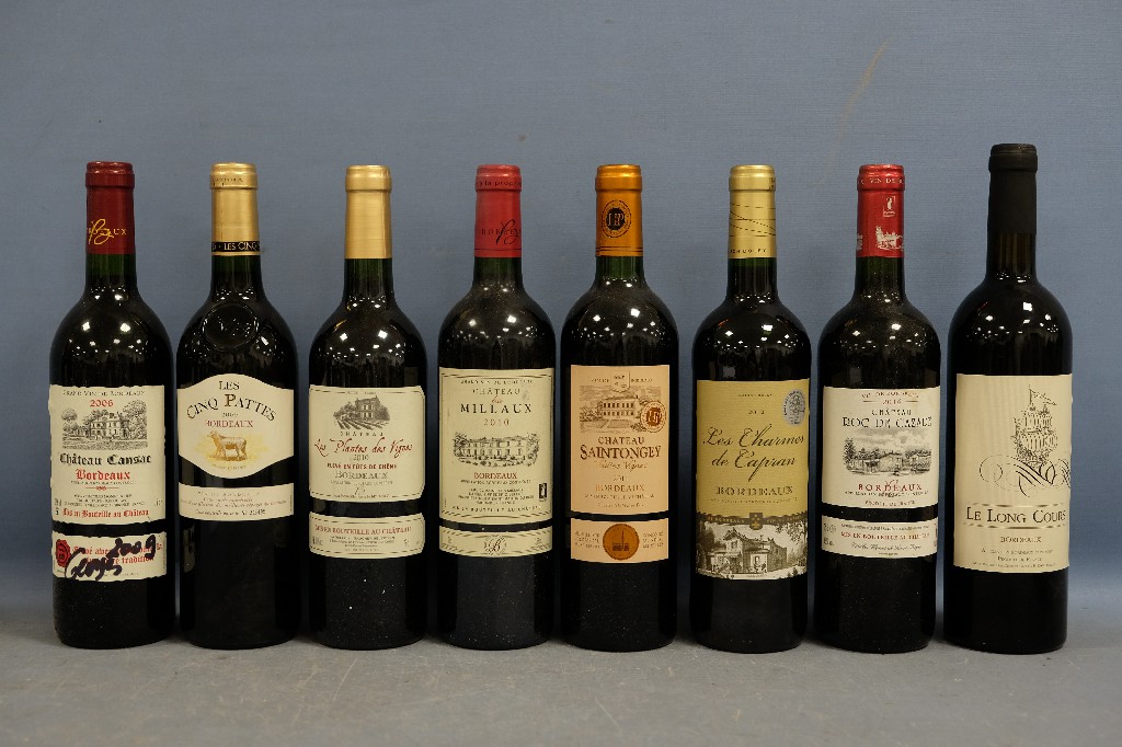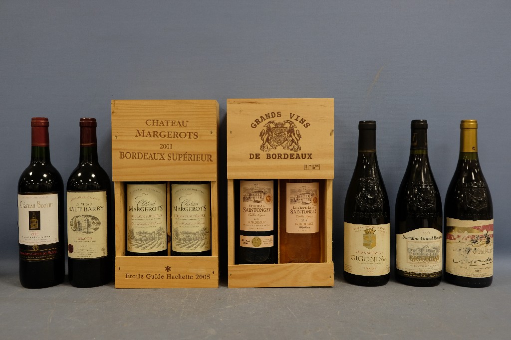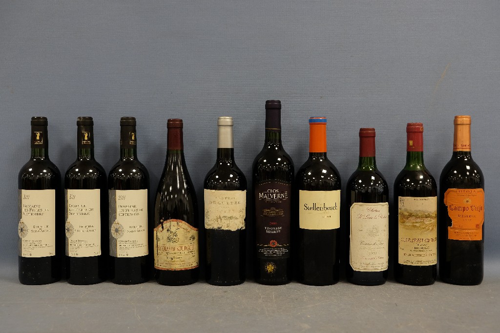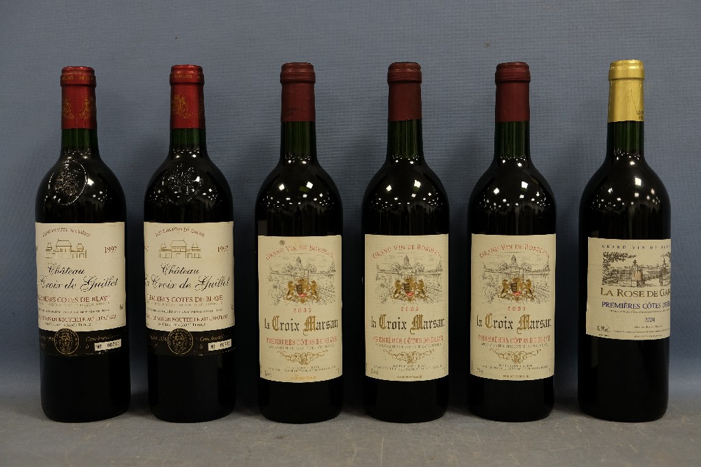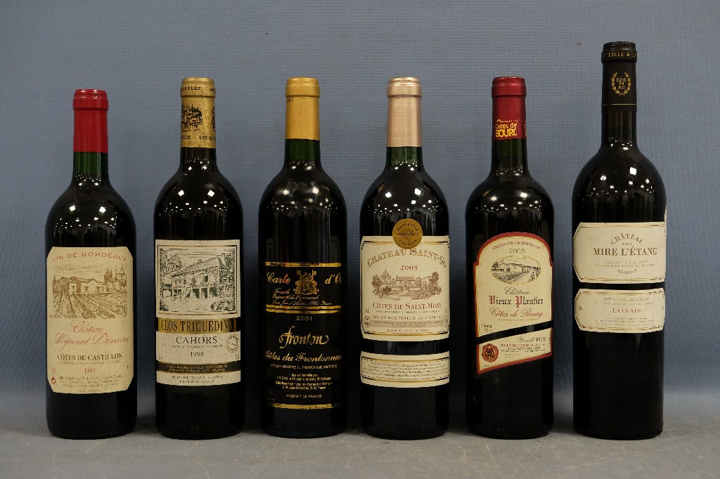 Lot de 6 bouteilles de vin rouge comprenant : Château Reynaud Dunesme,Côtes de Castillon 1997 ; Clos Triguedina, Cahors 1998 ; Fronton, Côtes du Frontonnais 2001 ; Château Saint-Go, Côtes de Saint-Mont 2003 ; Château Vieux Plantier, Côtes de Bourg 2005 et Château Mire L' Etang, La Clape, Coteaux du Languedoc 2007 | 80 - 120 € | Sélectionner |