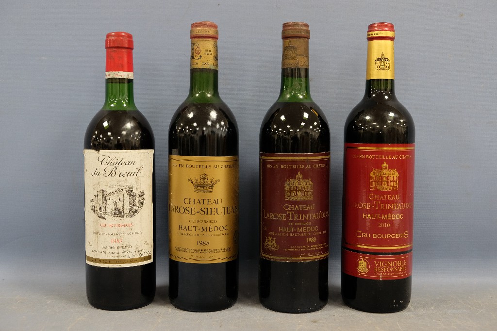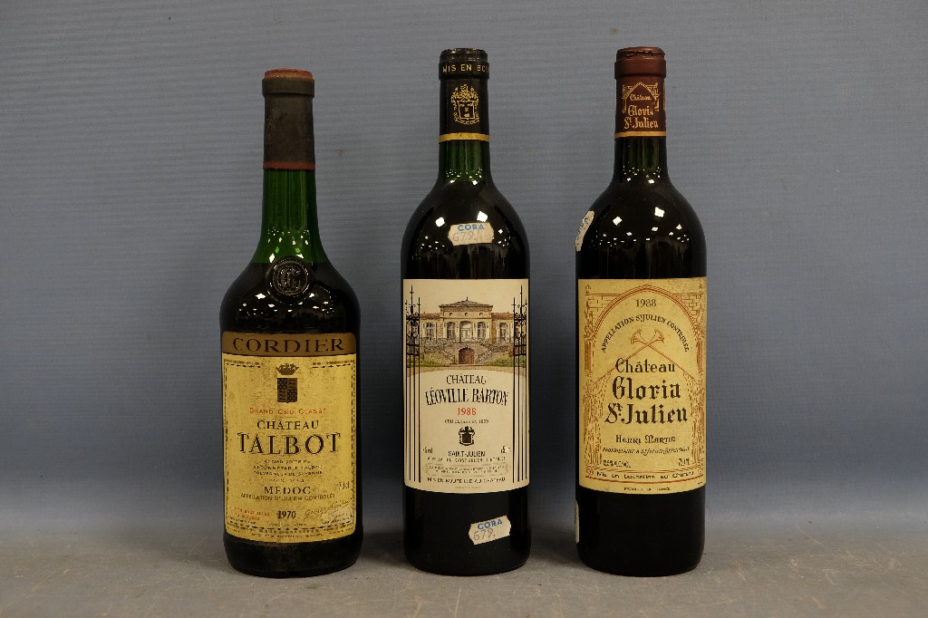 Château Talbot, Saint-Julien grand cru classé 1970 (1 bouteille), Château Léoville Barton, Saint-Julien 1988 (1 bouteille) et Château Gloria Saint-Julien, Saint-Julien 1988 (1 bouteille) | 150 - 200 € | Sélectionner |