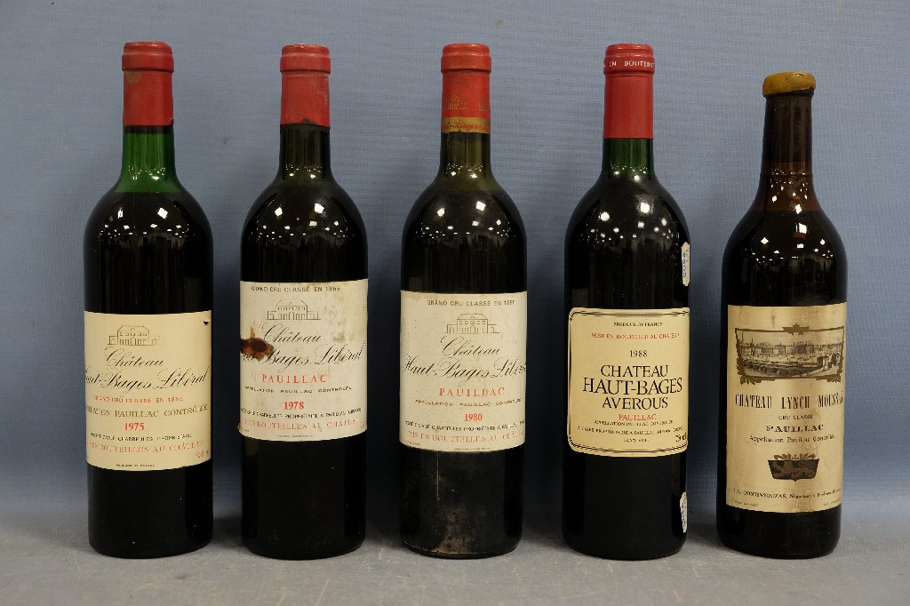 PAUILLAC : Château Haut-Bages Libéral 1975, 1978 et 1980 (1 bouteille de chaque), Château Haut-Bages Averous 1988 (1 bouteille) et Château Lynch Moussas, cru classé (1 bouteille) | 180 - 220 € | Sélectionner |