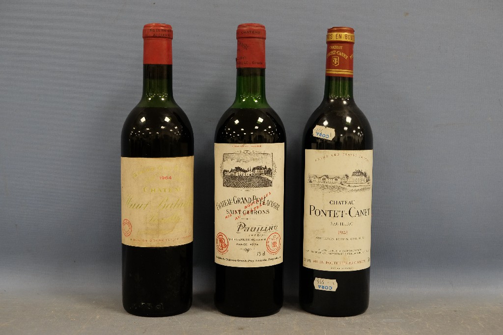 PAUILLAC : Château Haut Batailley, grand cru classé 1964 (1 bouteille), Château Grand-Puy-Lacoste 1974 (1 bouteille) et Château Pontet-Canet 1988 (1 bouteille) | 200 - 300 € | Sélectionner |