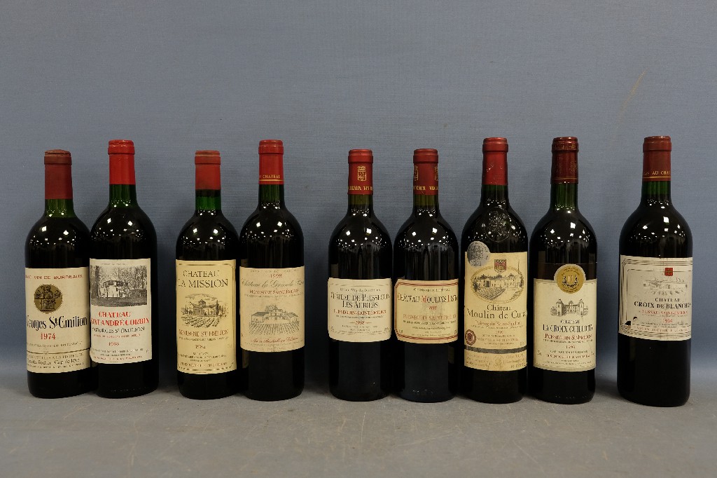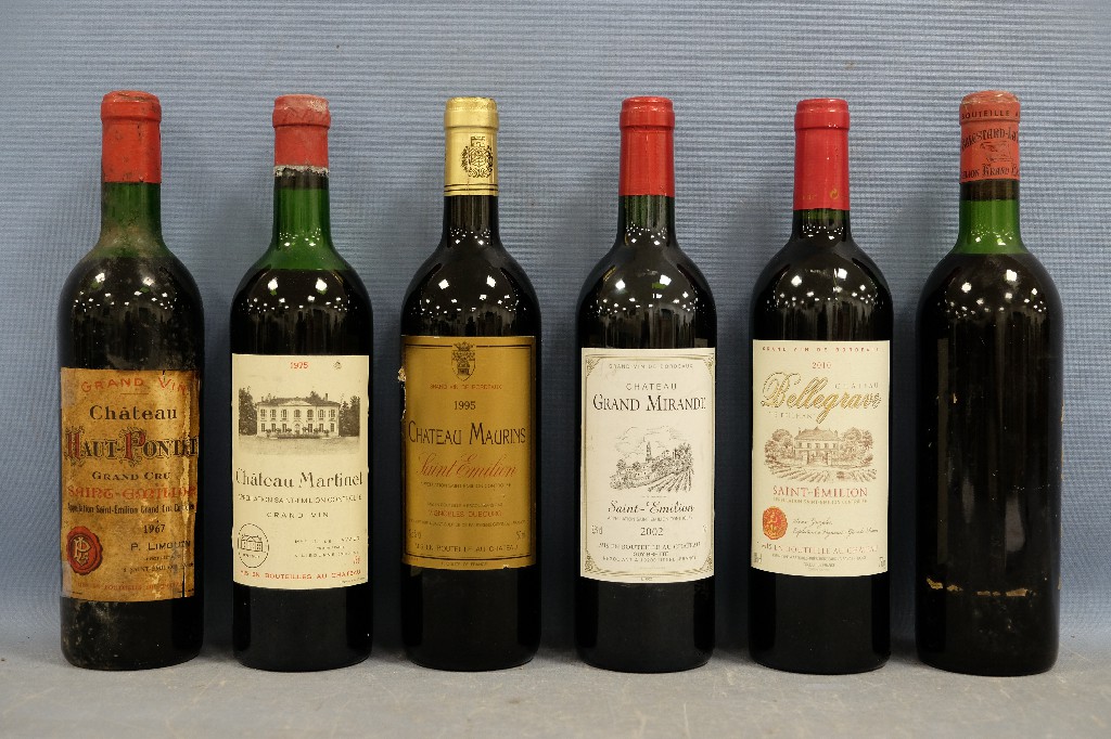 SAINT-EMILION : Château Haut-Pontet, grand cru 1967 (1 bouteille), Château Martinet 1975 (1 bouteille), Château Maurins 1995 (1 bouteille), Château Grand Mirande 2002 (1 bouteille), Bellegrave « Le Pheilhan » 2010 (1 bouteille) et Château Balestard-La-Tonnelle, grand cru classé (sans étiquette) (1 bouteille) | 80 - 120 € | Sélectionner |
