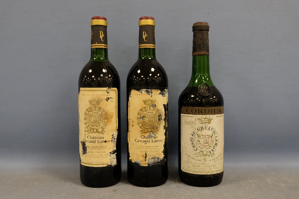 Château Gruaud Larose, Saint-Julien grand cru classé 1986 (2 bouteilles) et Château Graud Larose, Cordier, Saint-Julien grand cru classé (1 bouteille sans millésime) | 180 - 220 € | Sélectionner |