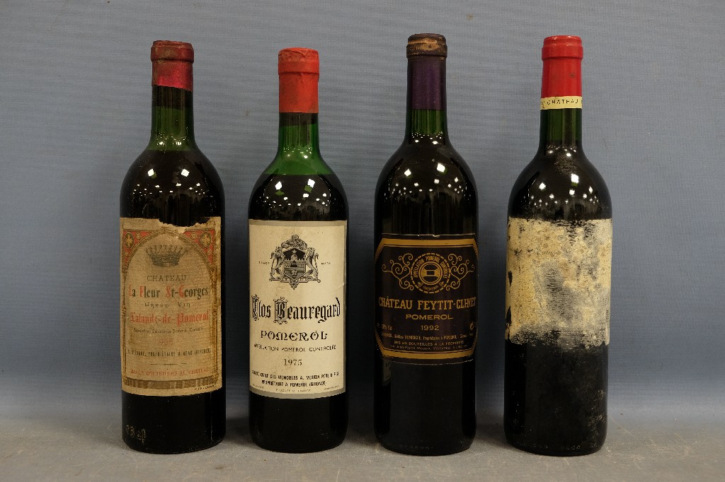 Château La Fleur Saint-Georges, Lalande de Pomerol 1955 (1 bouteille) et POMEROL : Clos Beauregard 1975 (1 bouteille), Château Feytit-Clinet 1992 (1 bouteille) et Château L'Ermitage de Bel-Air (pas de millésime (1 bouteille) | 80 - 120 € | Sélectionner |
