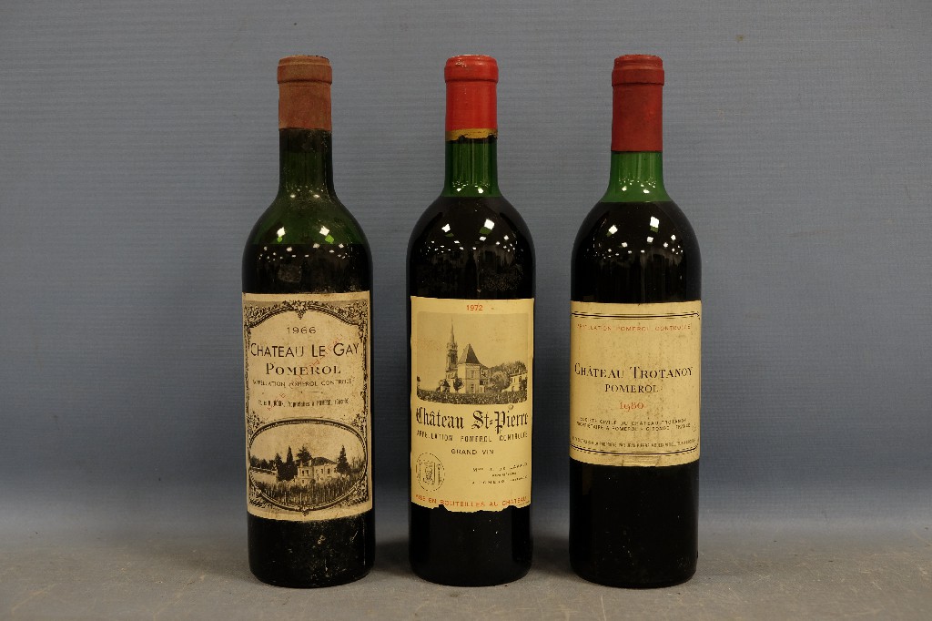 POMEROL : Château Le Gay 1966 (1 bouteille), Château Saint-Pierre 1972 (1 bouteille) et Château Trotanoy 1980 (1 bouteille) | 150 - 200 € | Sélectionner |