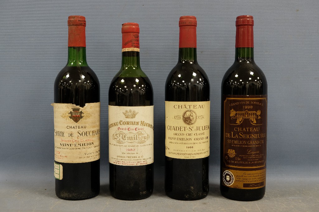 SAINT-EMILION GRAND CRU CLASSE : Château Faurie de Souchard 1974 (1 bouteille), Château Corbin Michotte 1982 (1 bouteille), Château Guadet-Saint-Julien 1988 (1 bouteille) et SAINT-EMILION GRAND CRU : Château de la seigneurie 1998 (1 bouteille) | 80 - 120 € | Sélectionner |