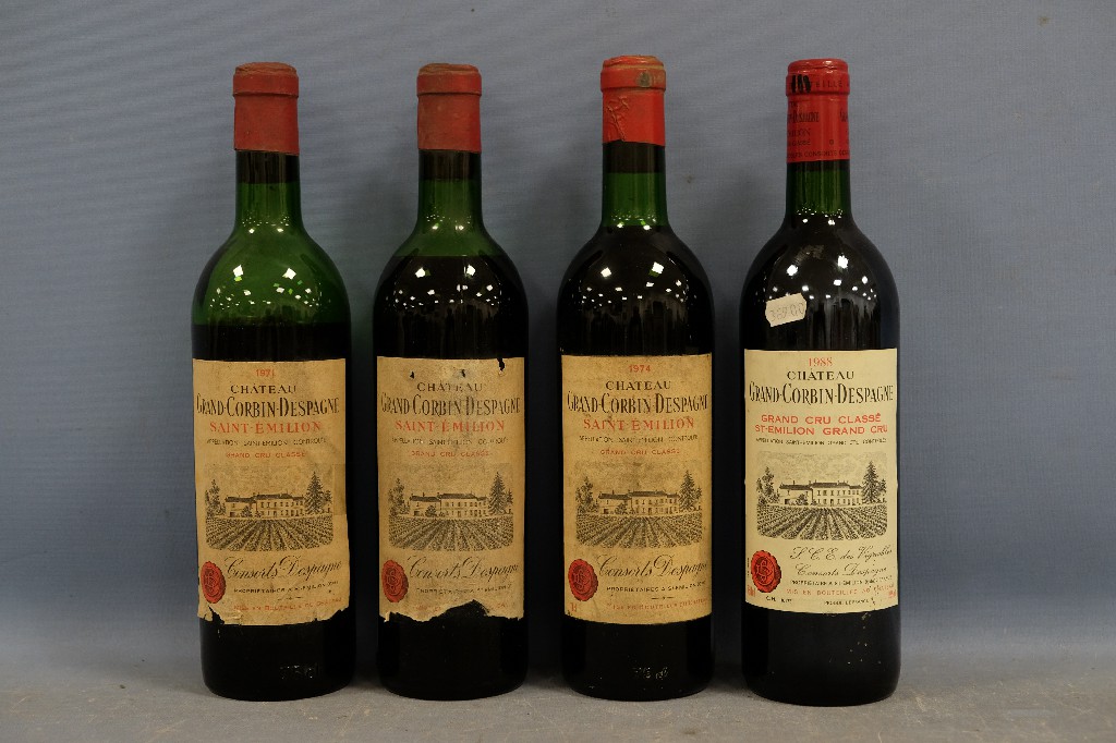 Château Grand-Corbin-Despagne, Saint-Emilion grand cru classé 1971 (2 bouteilles), 1974 (1 bouteille) et 1988 (1 bouteille) | 150 - 200 € | Sélectionner |