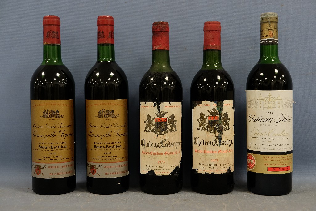 Château Grand Barrail Lamarzelle Figeac, Saint-Emilion grand cru classé 1975 (2 bouteilles), Château Lassègue, Saint-Emilion grand cru 1975 (2 bouteilles) et Château Patris, Saint-Emilion grand cru 1975 (1 bouteille) | 200 - 300 € | Sélectionner |