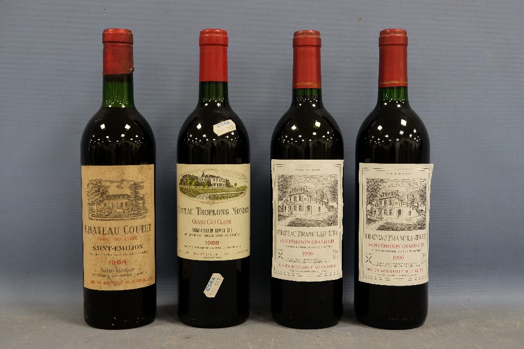 Château Coutet, Saint-Emilion grand cru classé 1964 (1 bouteille), Château Troplong Mondot, Saint-Emilion grand cru classé 1988 (1 bouteille) et Château Franc Lartigue, Saint-Emilion grand cru 1996 (2 bouteilles) | 180 - 220 € | Sélectionner |