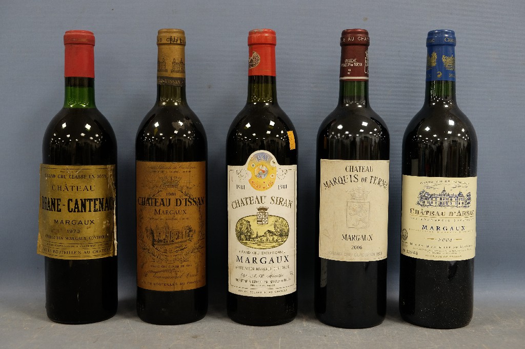 MARGAUX : Château Brane-Cantenac 1973 (1 bouteille), Château D'Issan 1981 (1 bouteille), Château Siran 1981 (1 bouteille), Château Marquis de Terme 2006 (1 bouteille) et Château d'Arsac 2003 (1 bouteille) | 150 - 200 € | Sélectionner |