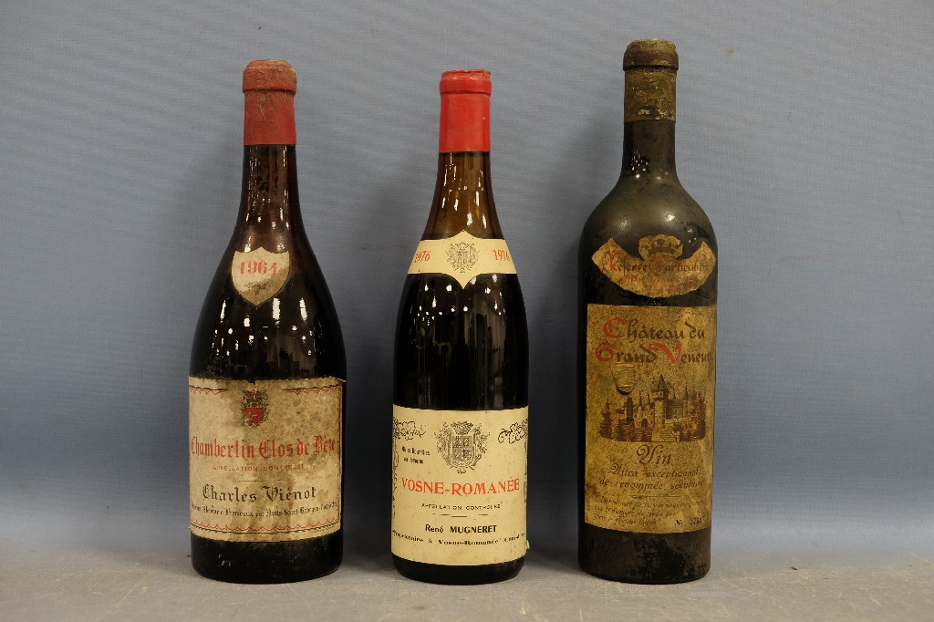 Chambertin Clos de Bèze, Charles Viénot 1964, Vosne-Romanée, René Mugneret 1976 et Château du Grand Veneur, réserve particulière (pas de millésime) | 100 - 200 € | Sélectionner |