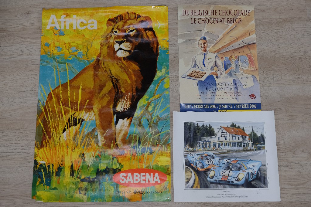 Affiche Sabena (101x65), affiche « Le chocolat Belge » (60x40) et lithographie de Carlos Ghys (43x50) | 30 - 50 € | Sélectionner |